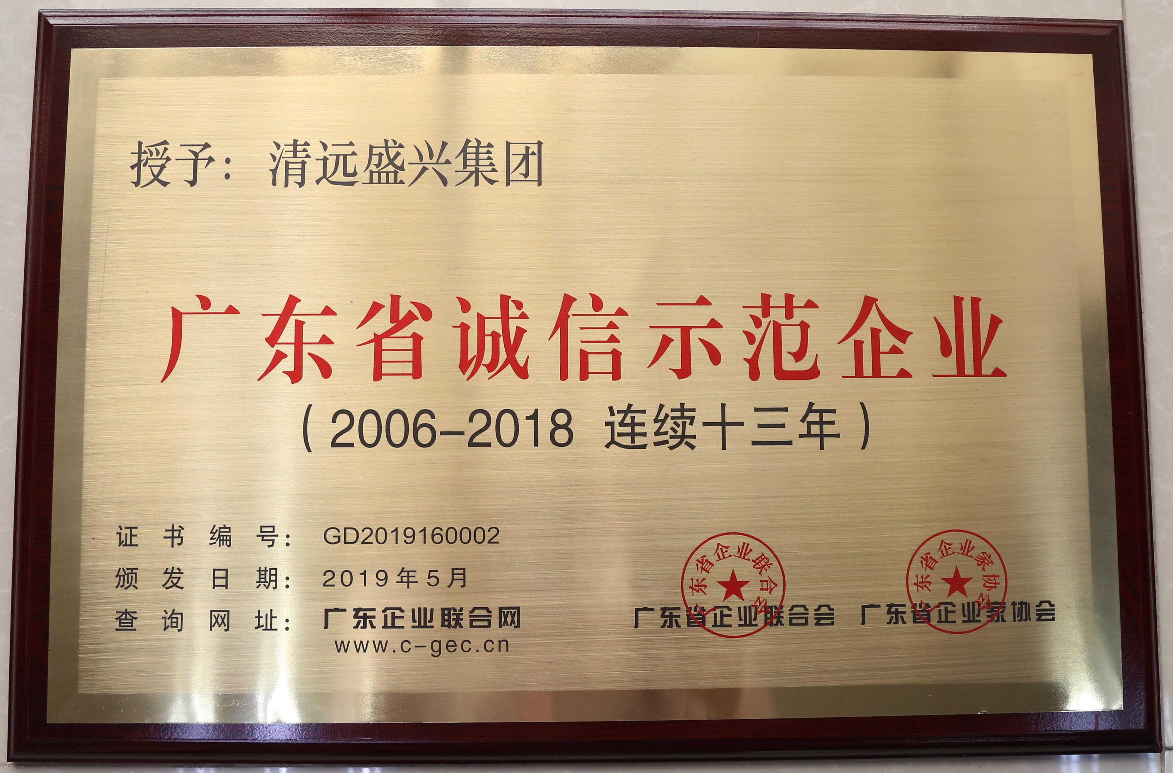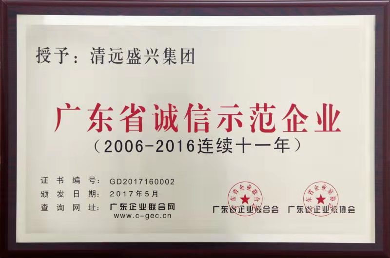 盛兴集团先后被评为“广东省诚信示范企业”“广东省守合同重信用企业”“清远市优秀企业”“清远市优秀民营企业”“清远市文明示范企业”“清远市爱国拥军模范单位”“清远市爱国卫生先进单位”等荣誉称号。2014年度,被评为“广东省最佳诚信企业”,2015—2018年连续四年度获得“广东省优秀企业”称号。